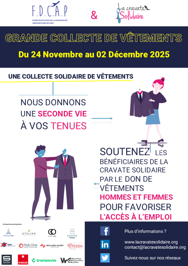 Du 24 novembre au 2 décembre 2025, une collecte solidaire de vêtements professionnels a été organisée par le FDCAP – Fonds de Dotation de la Communauté Aéroportuaire de Paris – en partenariat avec La Cravate Solidaire et les équipes de l’engagement sociétal du Groupe ADP. Une mobilisation d’ampleur inédite, à l’échelle des aéroports de Paris-Orly et Paris-Charles de Gaulle.