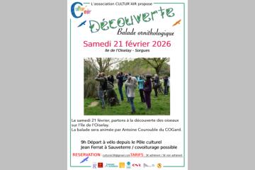 EN compagnie d'Antoine Courouble animateur au COGard, partons à la découverte de l'avifaune et du biotope de l'île de l'Oiselay à Sorgues. Un départ à vélo se fera depuis le pôle culturel Jean Ferrat de Sauveterre le samedi 21 février 2026 à 9h. Réservation obligatoire par mail à ...