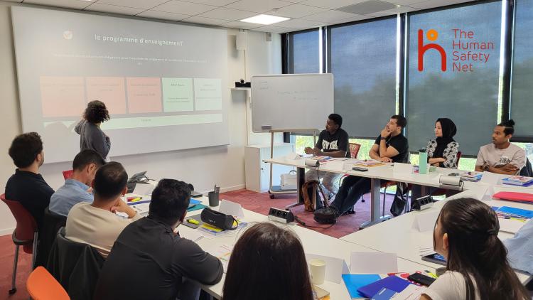 Ce dispositif s’appelle ENT.RE – Entreprises & Réfugiés, un programme imaginé par l’association Pierre Claver et soutenu par The Human Safety Net. Pendant 4 à 5 mois, les apprenants suivent leurs cours de français et de culture générale directement dans les locaux d’une entreprise hôte. Ils sont également accompagnés par un tuteur avec qui ils échangent sur leurs projets, leurs difficultés et leur progression, tout en pratiquant la langue.